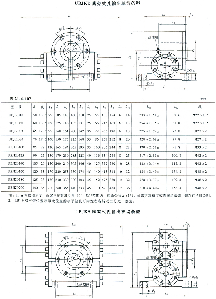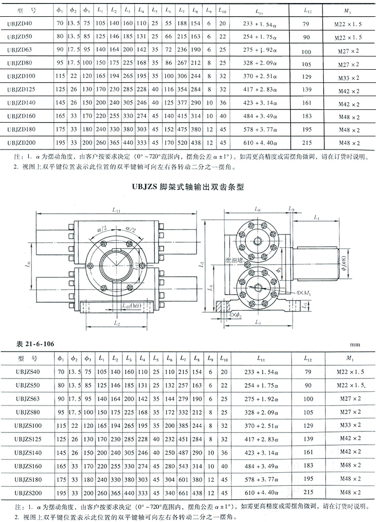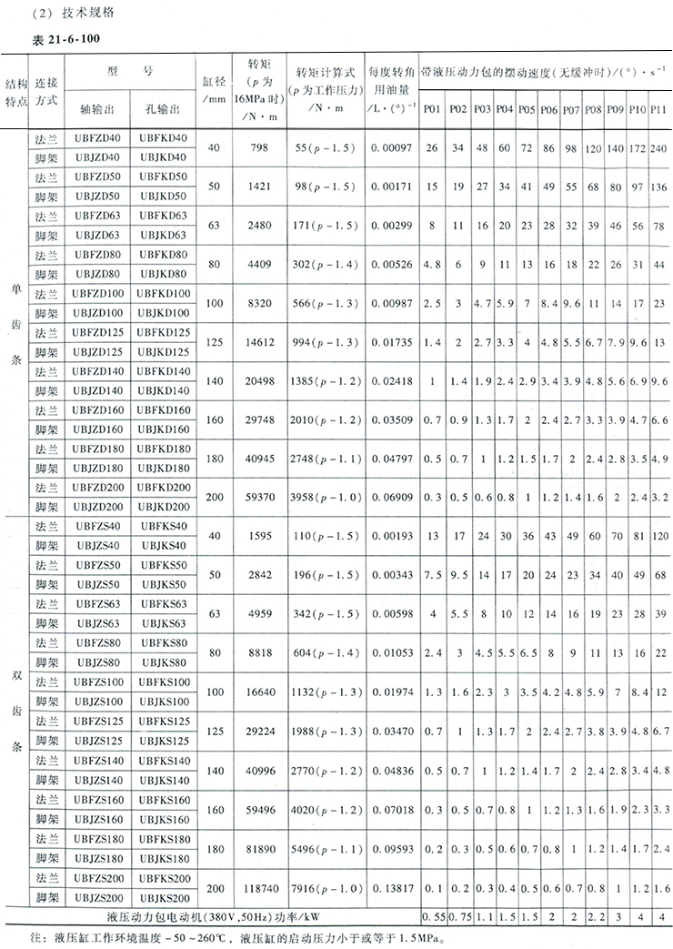 UB型齒輪齒條擺動(dòng)油缸公稱壓力為16MPa,有單齒條和雙齒條兩種結(jié)構(gòu)型式;有法蘭式和腳架式兩種安裝方式;有軸和孔兩種輸出方式。