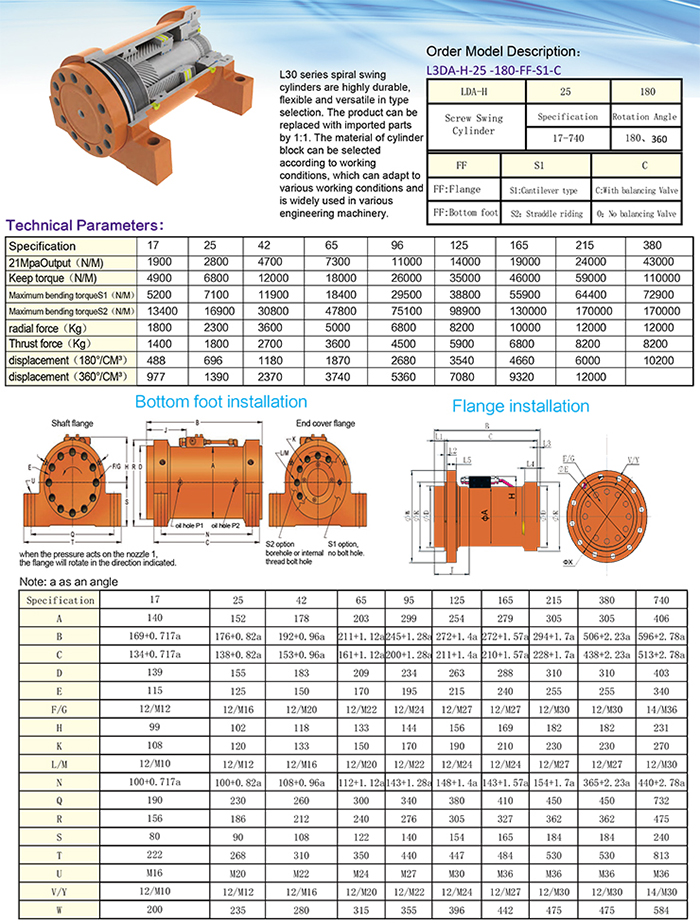 L30系列螺旋擺動(dòng)油缸具有高度的經(jīng)久耐用,選型靈活通用,本產(chǎn)品與進(jìn)口件可以1:1復(fù)換使用,并根據(jù)工況可以選擇缸體材質(zhì),適應(yīng)各種工況條件。